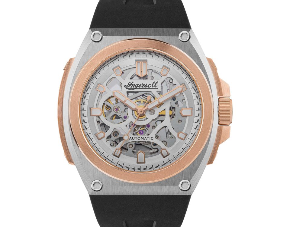 Impressing at first sight, the Ingersoll Motion Mens Watch I11703 features a bold and contemporary design. Complemented by an integrated black rubber strap and pin buckle fastening, this luxury watch with statement sports styling is finished with a rose gold and silver two-tone 48mm stainless steel case and exposed skeleton dial. Powered by a automatic movement, this unique timepiece is beautifully crafted for everyday wear.